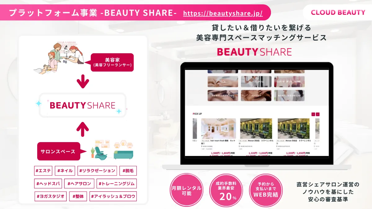 事業内容 美容サロン/美容家向けクラウドサービス・スペースシェアマッチング