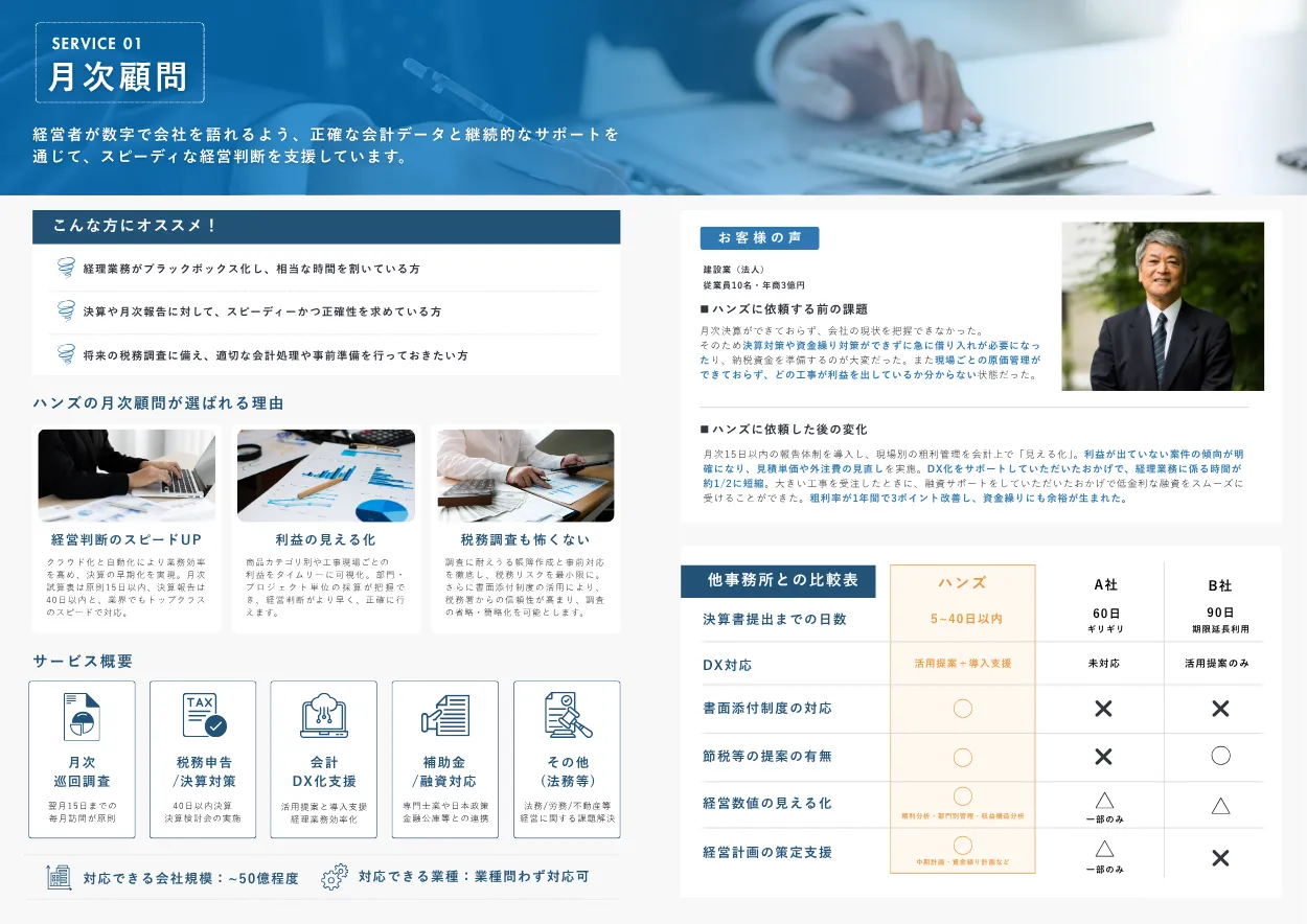 初めてのやり取りでは、どこまでお願いできるか不安もありましたが、実際には、事務所のビジョン構築や人材戦略、営業戦略に関する具体的なアドバイスまで積極的に提示いただき、想像以上の価値を提供してくださいました。