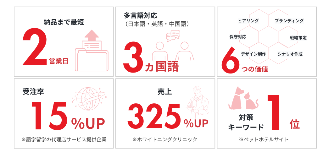 ただ見た目が良いだけの資料ではなく、「リード獲得率が上がる」「求人応募率が増える」など、成果につながる資料をご提供します。